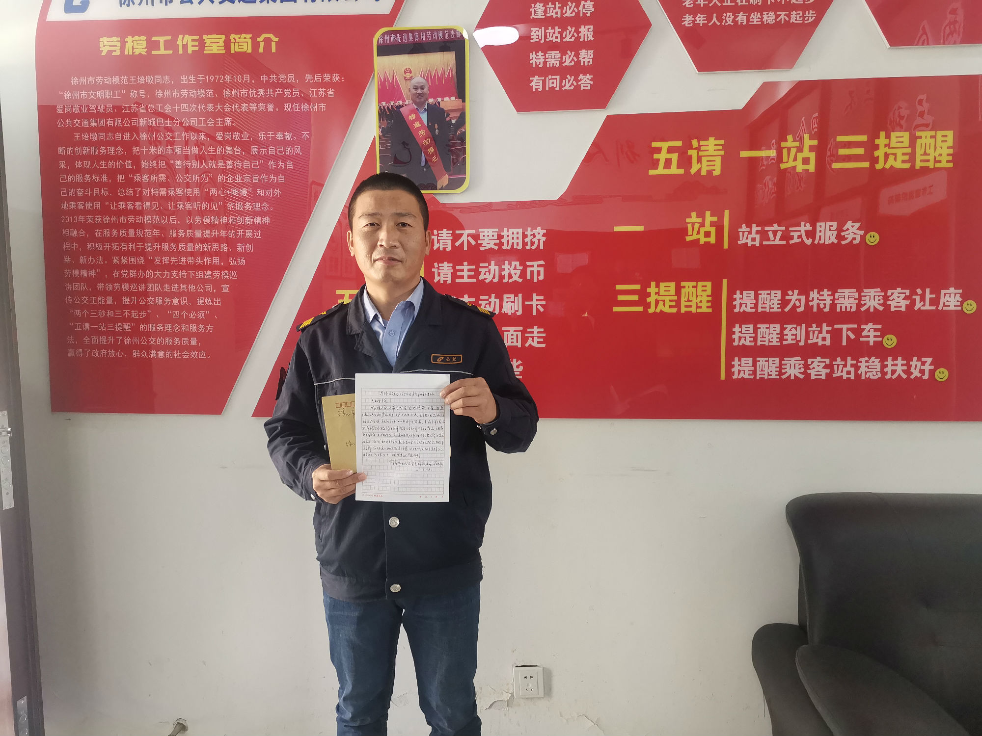 10月28日下午,一位滿頭銀發(fā)的老人拿著一封親手寫的感謝信來到了徐州公交新城公司,老人說:“有一位駕駛員,經(jīng)常幫助我和老伴,但我不知道他叫什么,只知道他在46路2750號公交車?!苯?jīng)核實,正是46路公交駕駛員郭開明師傅。