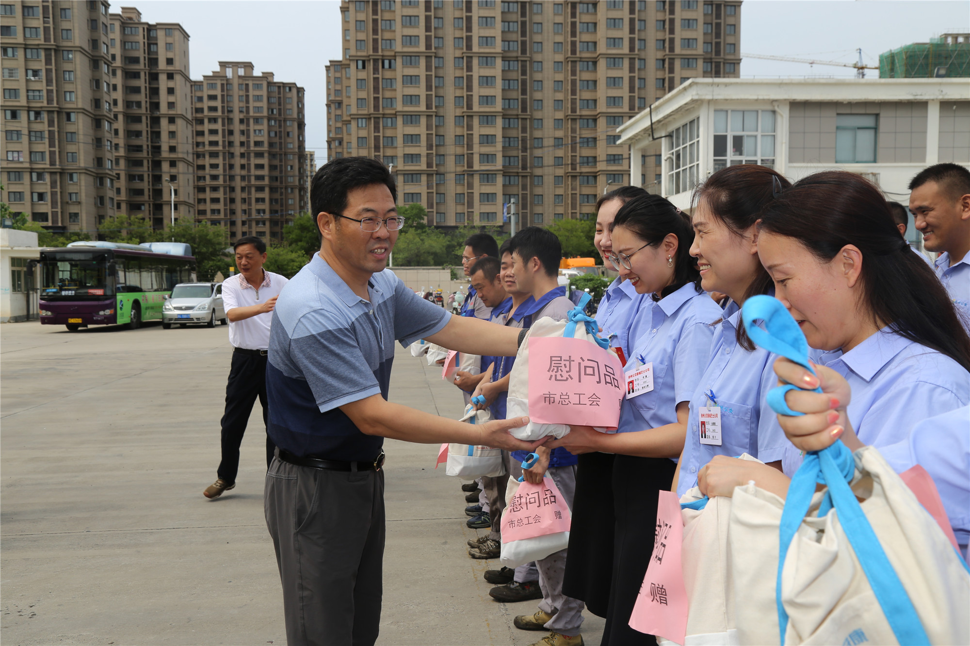慰問(wèn)現(xiàn)場(chǎng),市總王建民副主席親切地和公交職工們一一握手,并給他們送上防暑降溫的“清涼禮包”、醫(yī)用急救箱和《如何防止職業(yè)病》等安全書籍,對(duì)大家不畏酷暑堅(jiān)守工作崗位的辛苦付出和不懈努力,表示了衷心的感謝;并強(qiáng)調(diào)要高度重視職工健康和安全,扎實(shí)做好高溫期間防暑降溫和安全生產(chǎn)工作,多關(guān)注關(guān)心職工身體狀況,保障高溫一線職工的安全、健康,確保安全生產(chǎn);并叮囑廣大職工要增強(qiáng)自我保護(hù)意識(shí),合理休息、注意身體。